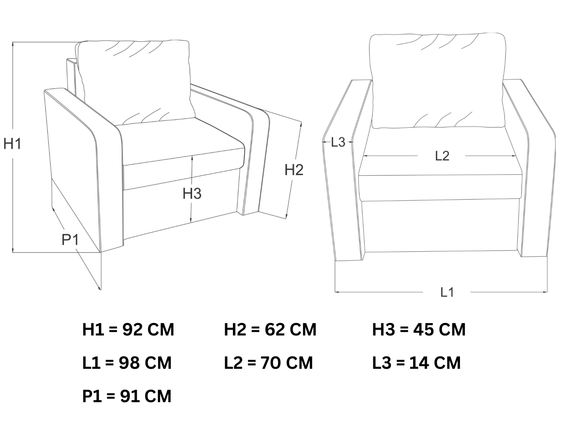 Dimensiuni: L = 98 cm, A = 91 cm, H = 92 cm (vezi schița atașată).