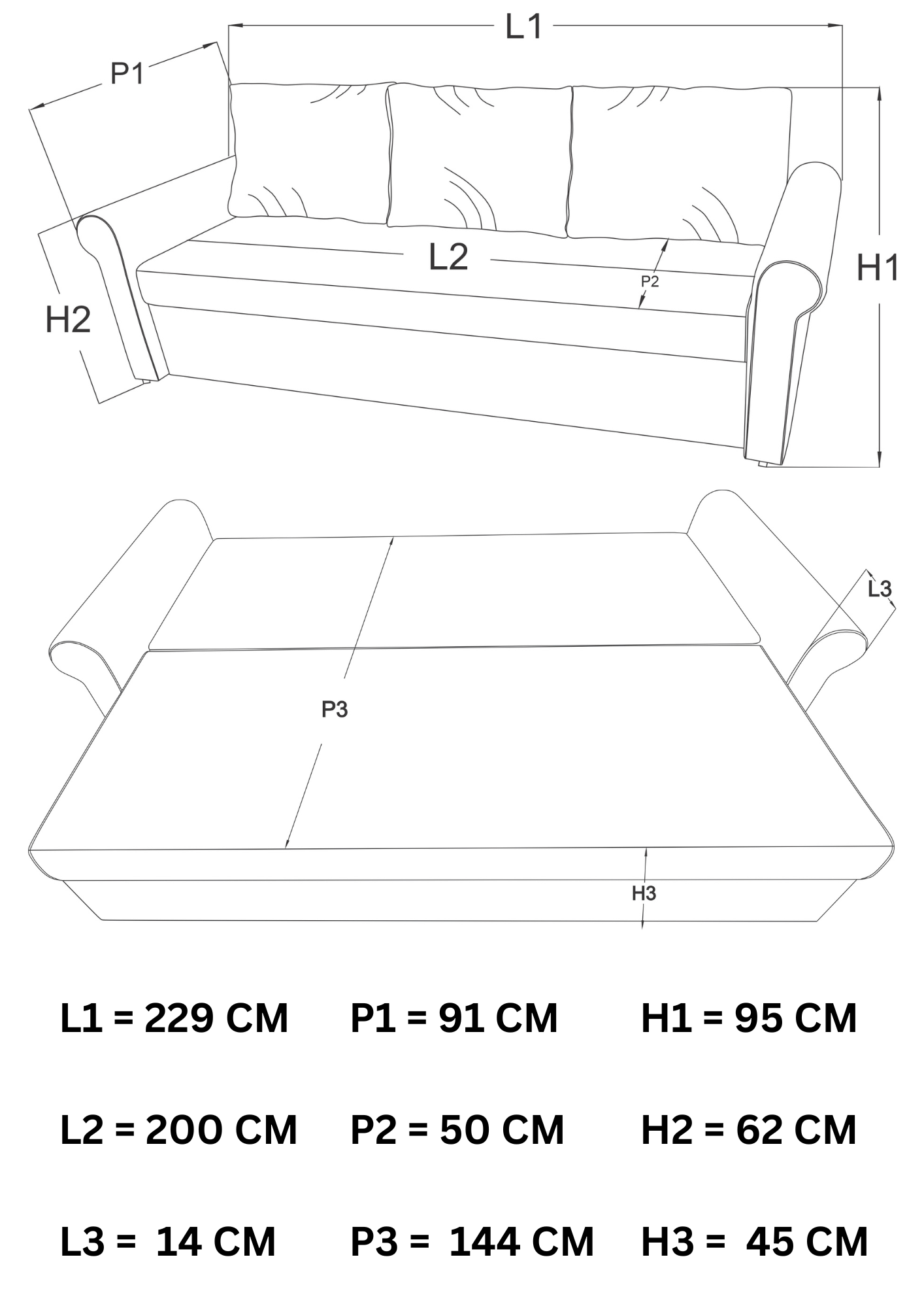✅ Dimensiuni: L1 = 229 cm, D1 = 91 cm, H1 = 95 cm