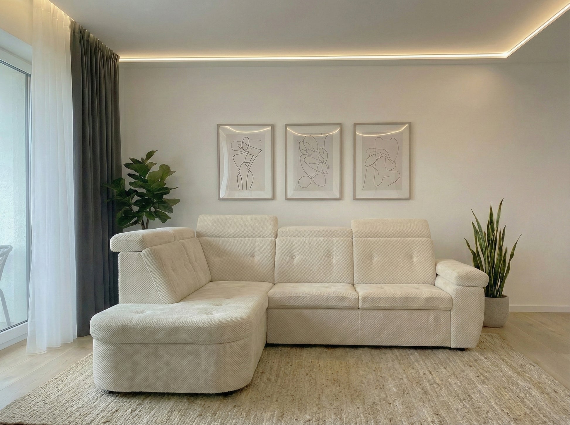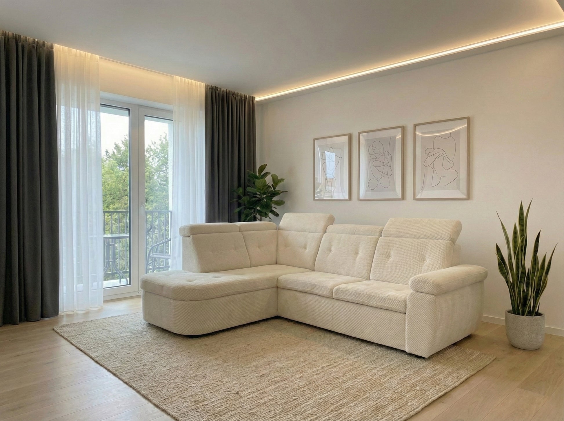 Un colțar modular în formă de L, care aduce echilibrul perfect între eleganță și confort. Designul său simplu și proporțiile armonioase îl fac alegerea ideală pentru orice living, de la apartamente moderne la case spațioase.