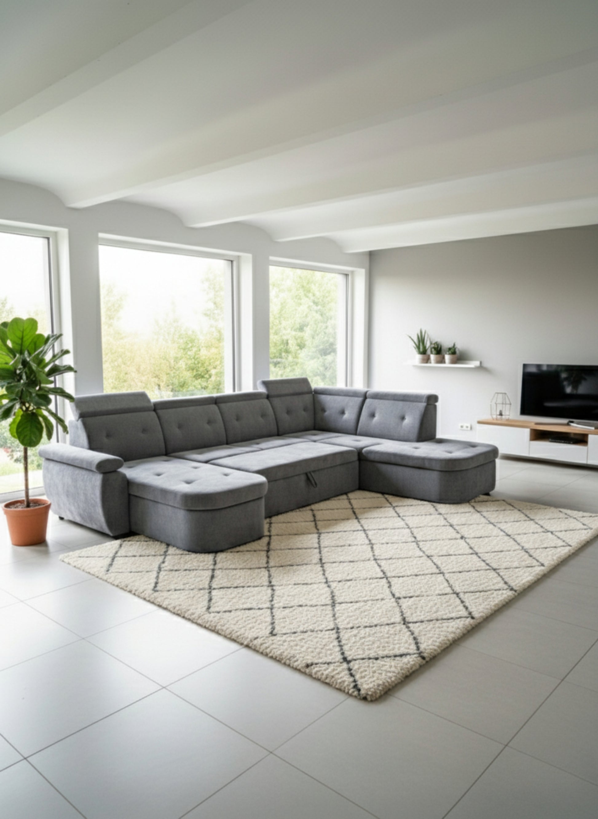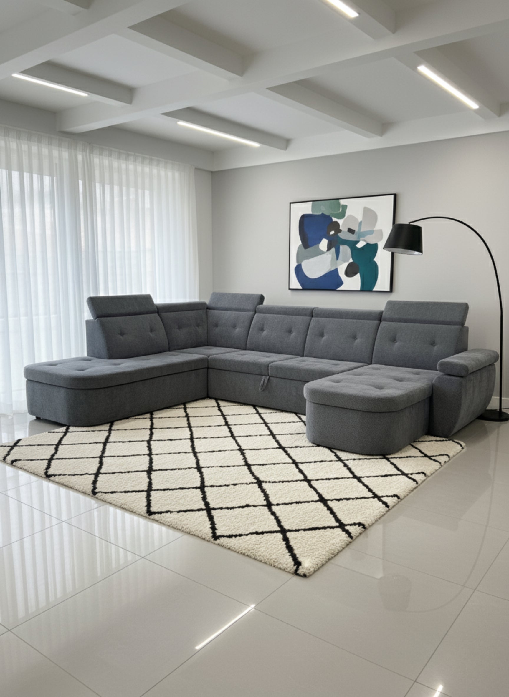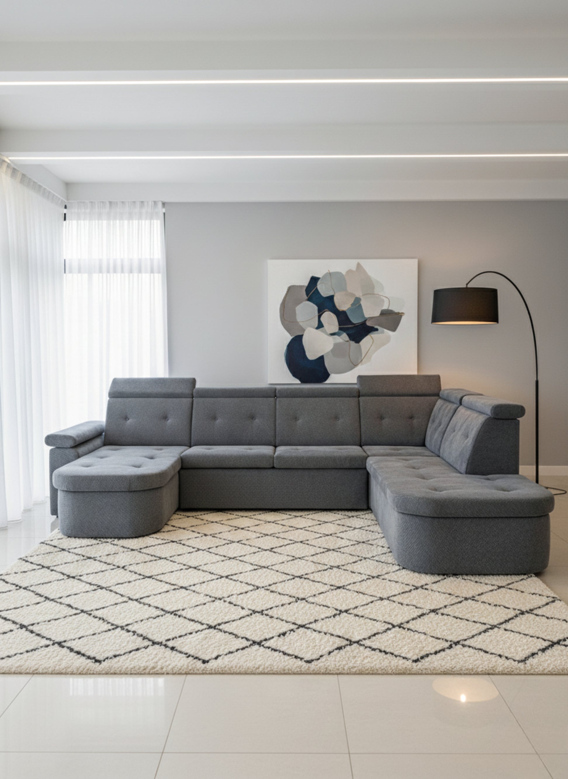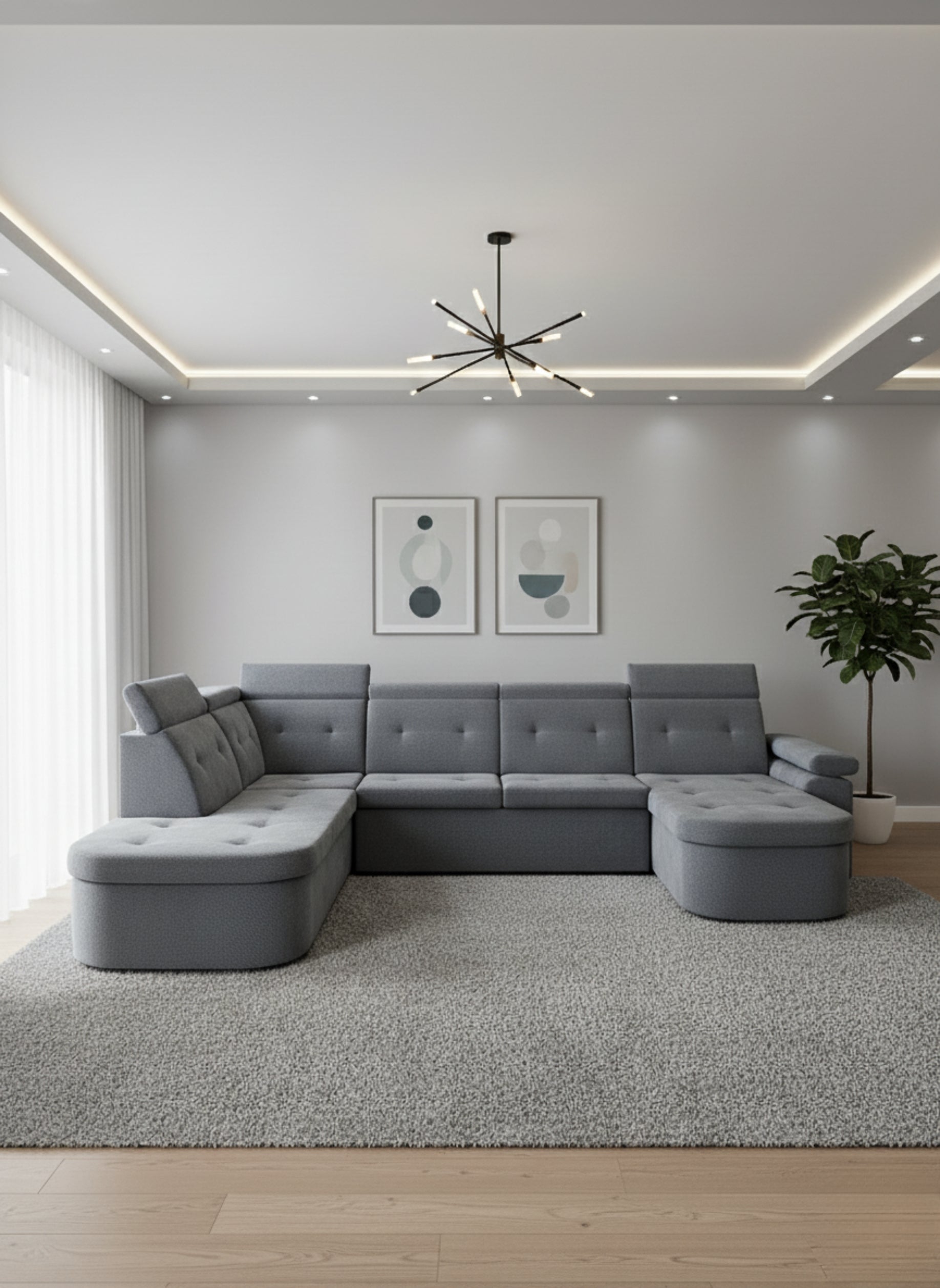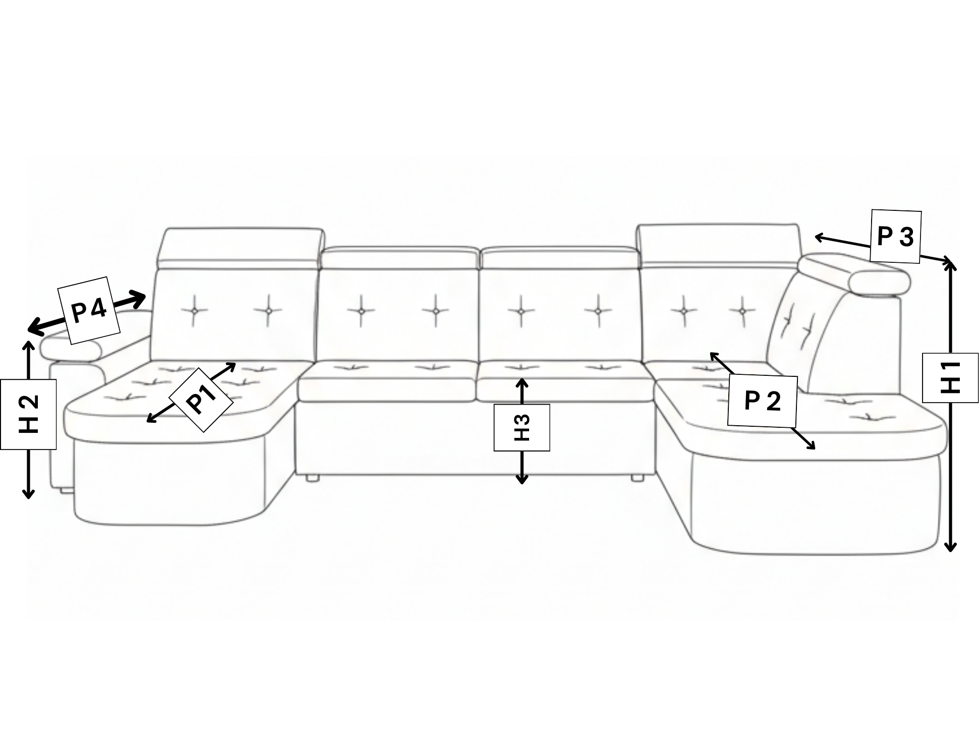 Un colțar modular în formă de U, creat pentru a oferi spațiu generos și confort deplin. Este ideal pentru livinguri mari, unde devine piesa centrală a încăperii.