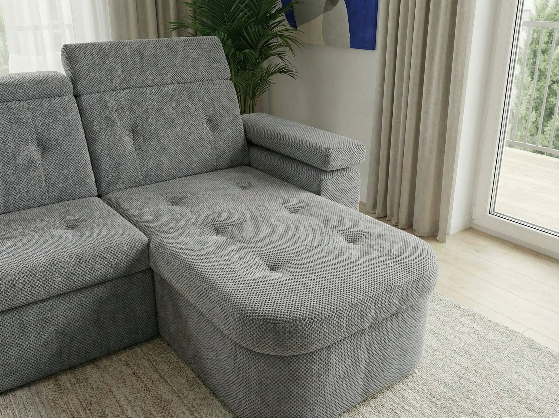 Canapeaua este extensibilă, transformându-se rapid într-un pat confortabil pentru oaspeți sau pentru momentele de relaxare în familie. Spătarul bine conturat și tetierele reglabile asigură susținere ergonomică, iar ottomanul adaugă funcționalitate și versatilitate. Construit din materiale de calitate superioară, rezistă în timp și păstrează eleganța chiar și la utilizare intensă.